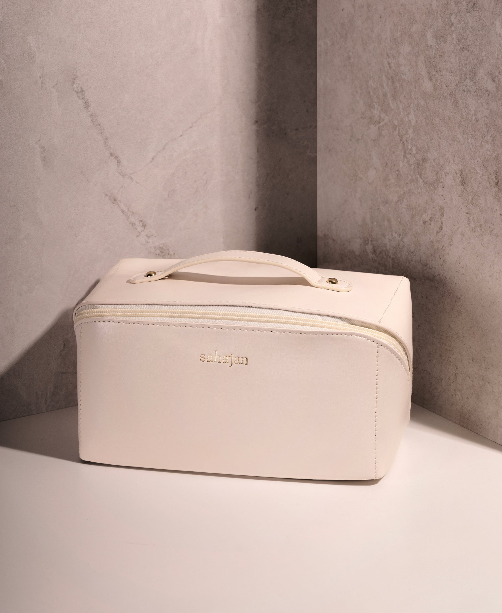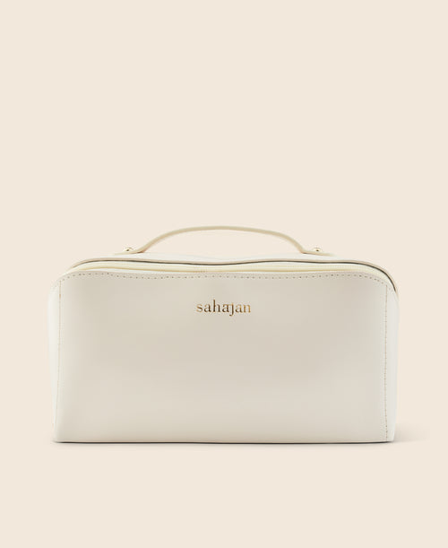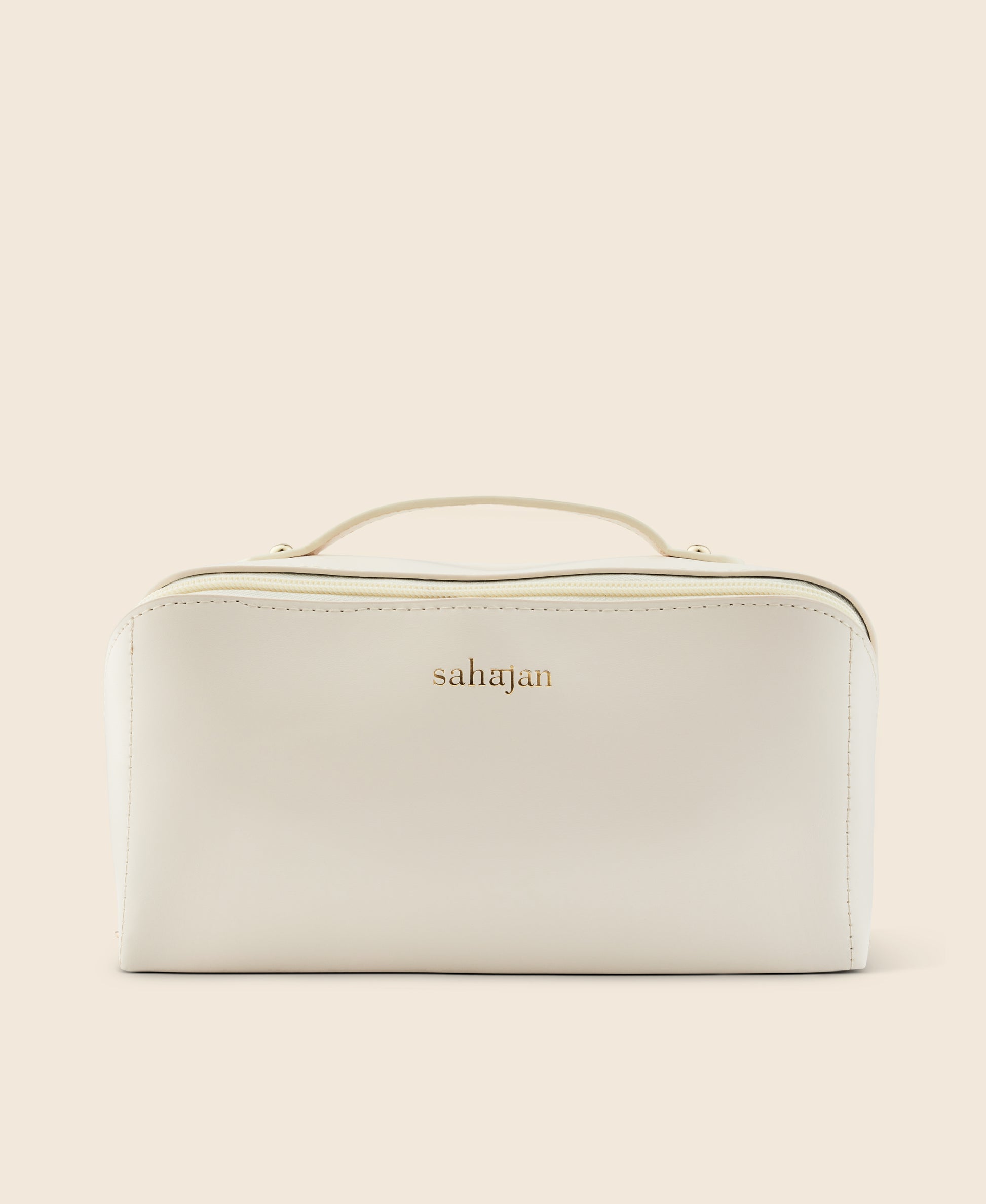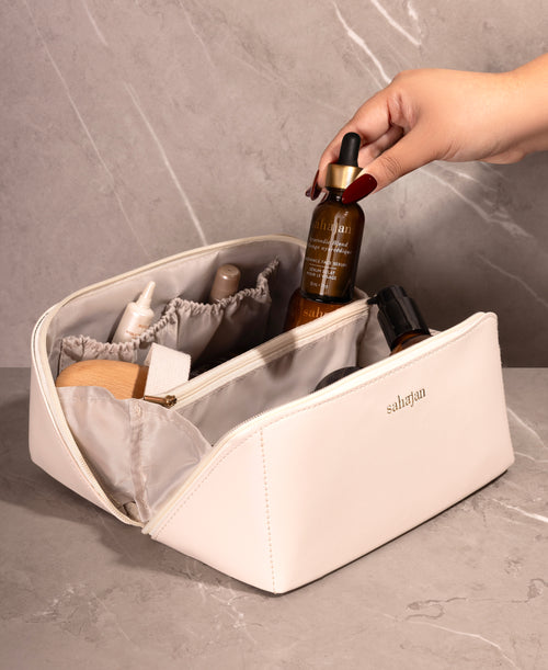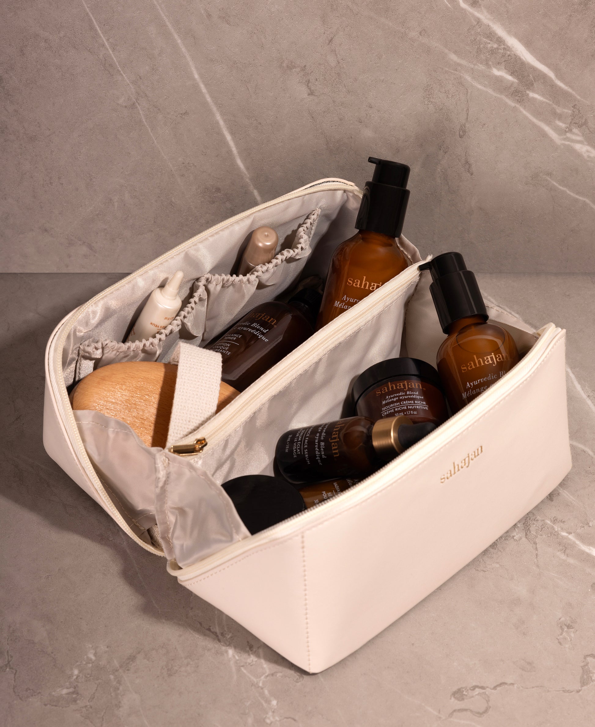 This vegan leather makeup bag was designed to house your Sahajan skincare collection and more. Fits both full-sized and travel-sized bottles of your favorite beauty products.